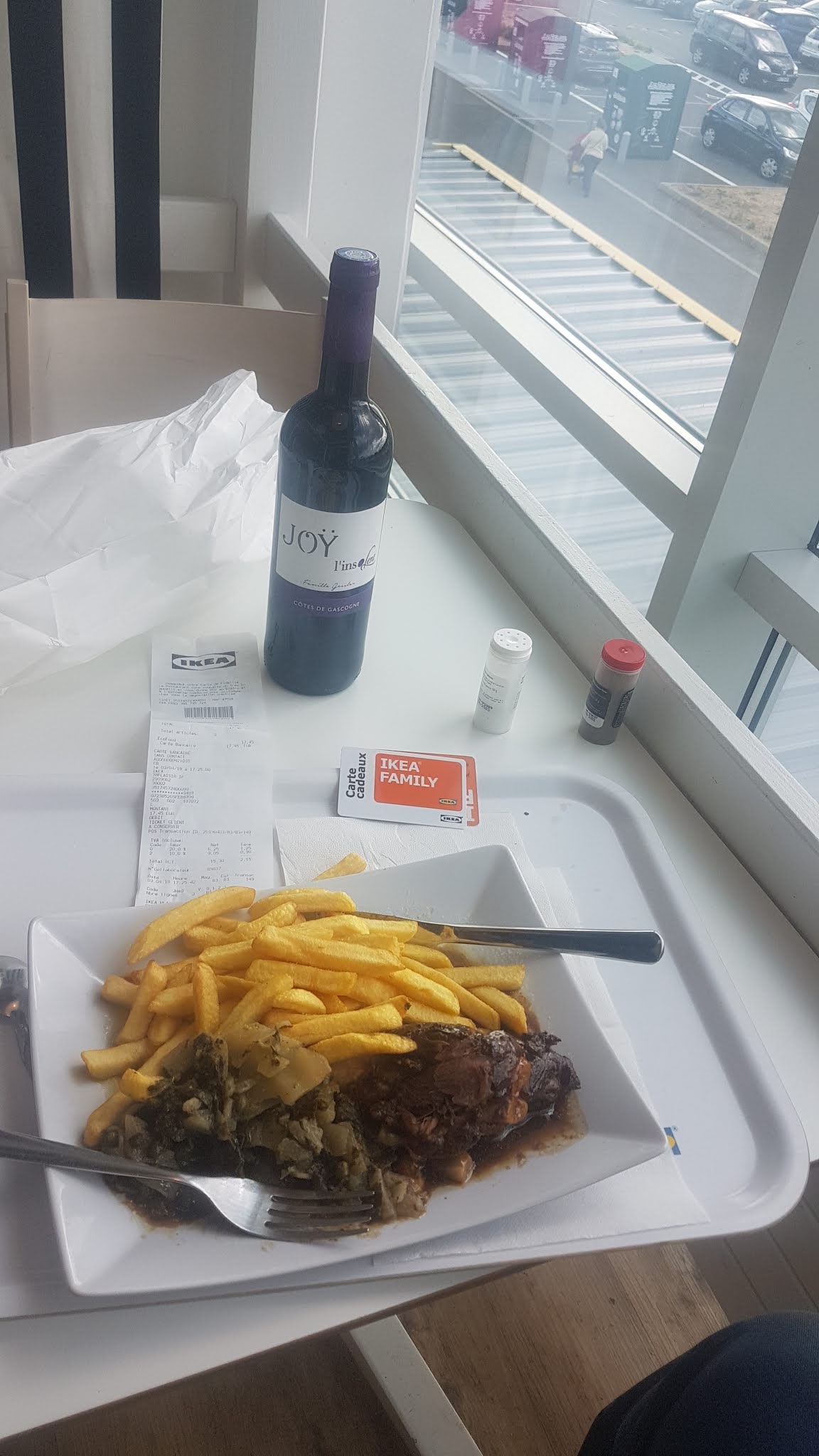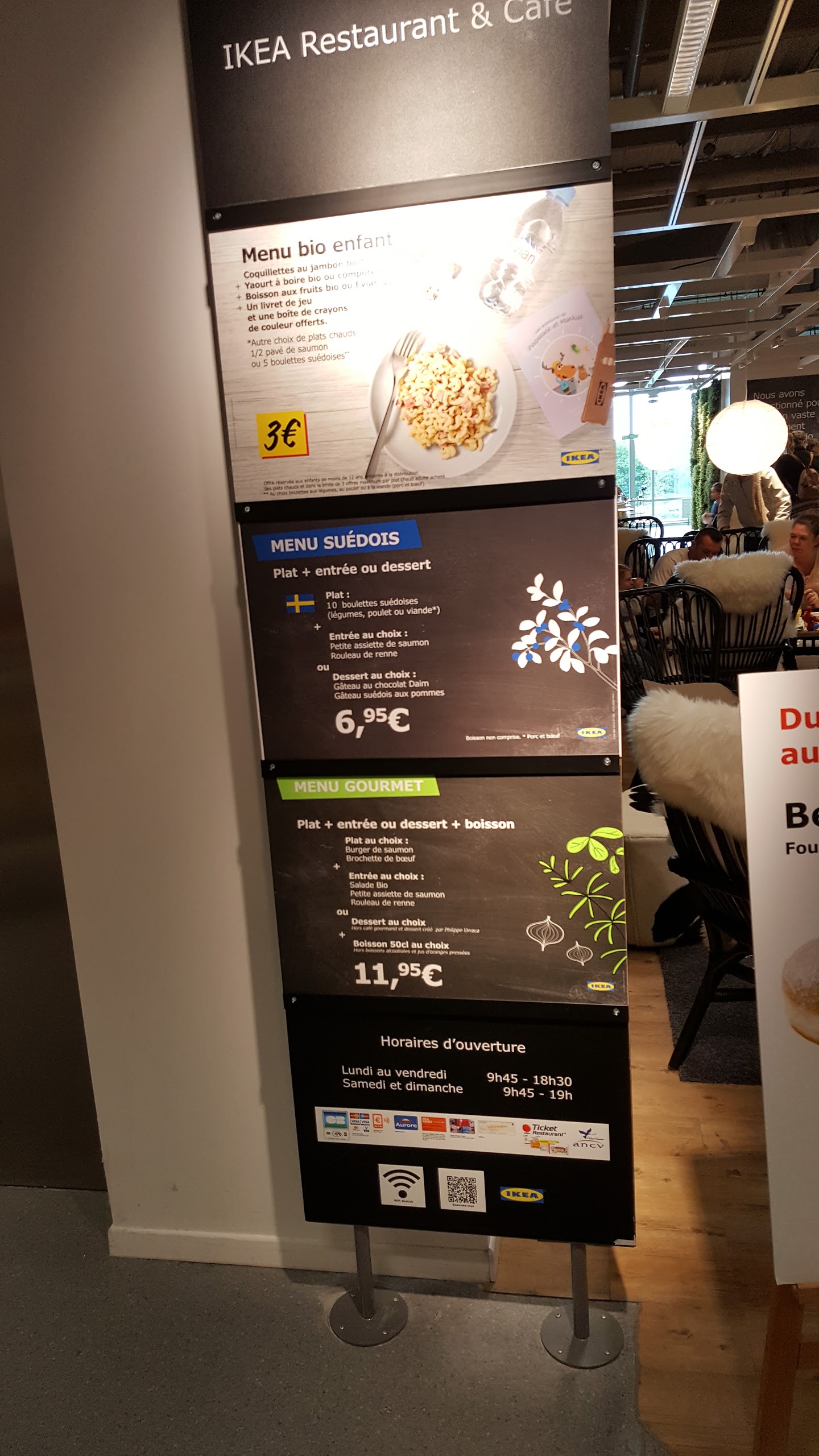Restaurant idéal pour le midi, ou avec les enfants. Ce n'est pas de la grande gastronomie mais c'est correct, tarifs non excessif. Une petite salade 2.30 avec un pain à 0.75€ je crois.3€ le menu enfants avec plat + boisson + yaourt à boire. Café offert si on a la carte Ikea. Sur place il y a tout le matériel Ikea pour enfants : réhausseur, gobelets, chaise haute, porte manteau...